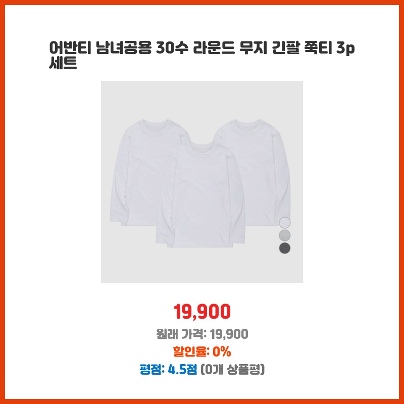 어반티 남녀공용 30수 라운드 무지 긴팔 쭉티 3p 세트